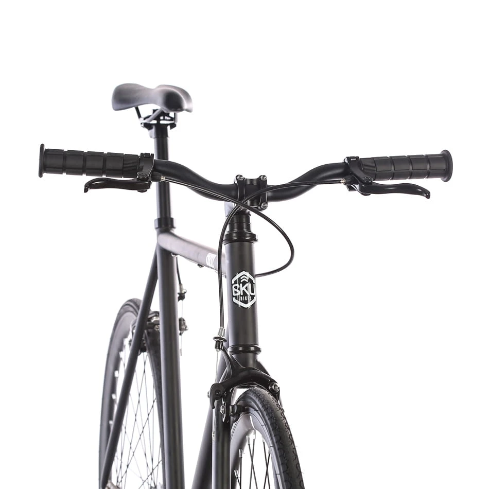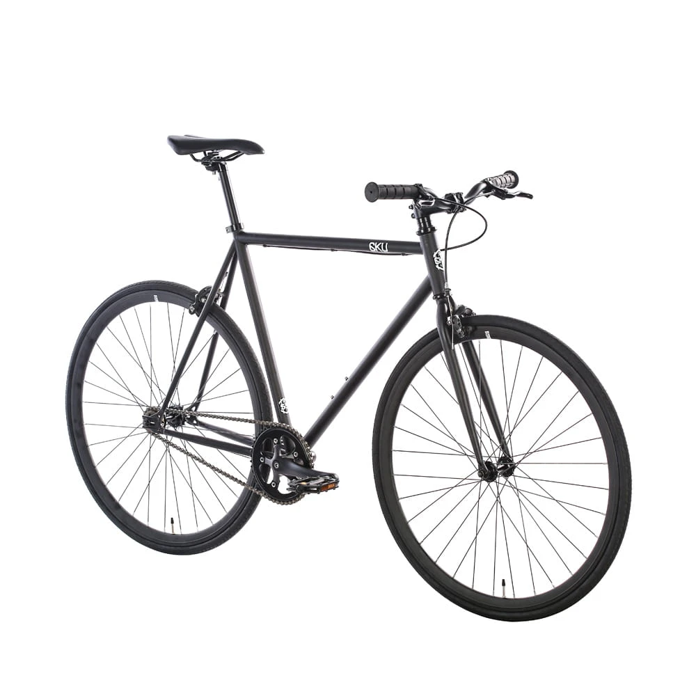 Das Nebula 1 von 6KU ist ein klassisches Singlespeed/Fixed Komplettbike, welches durch den komplett matt-schwarzen Look sehr edel wirkt. In Verbindung mit den hauseigenen Felgen macht das schon mal Einiges her. Der Antrieb funktioniert klassisch über eine FlipFlop-Nabe, mit der du entweder Singlespeed oder fixed unterwegs sein kannst.